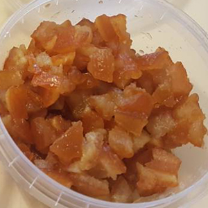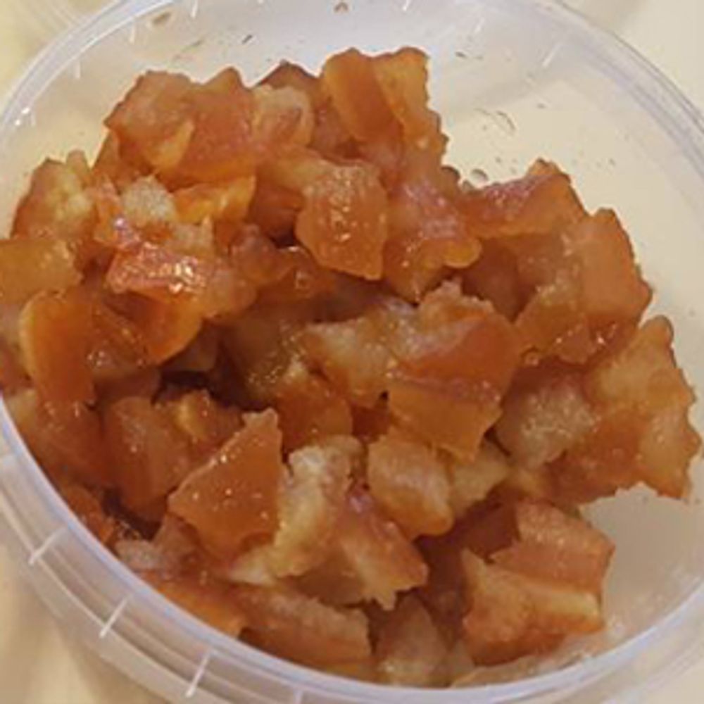 Кубики из апельсиновой корочки, некалиброванные, плотной консистенции, без видимой кристаллизации, сладкие, со вкусом и запахом цитрусовых, ярко-оранжевого цвета. Состав: Апельсиновая корка, глюкозный сироп, сахар, регулятор кислотности: лимонная кислота (Е330). Содержание сахаров в продукте - 63%.