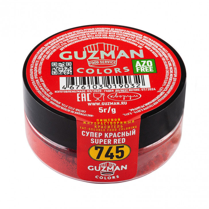 Сухие красители GUZMAN отлично подойдут для придания сочного цвета изделию. Краситель отлично проявляет себя даже на маслянистых и жирных массах. Глубокий цвет, точная цветопередача, малый расход благодаря сильной концентрации пигмента и моментальное смешивание с окрашиваемой массой позволяют удобно и быстро получить сочный оттенок. При использовании красителя требуется растопить шоколад и добавить требуемое количество жирорастворимого красителя, дозировка для использования 0,002%.