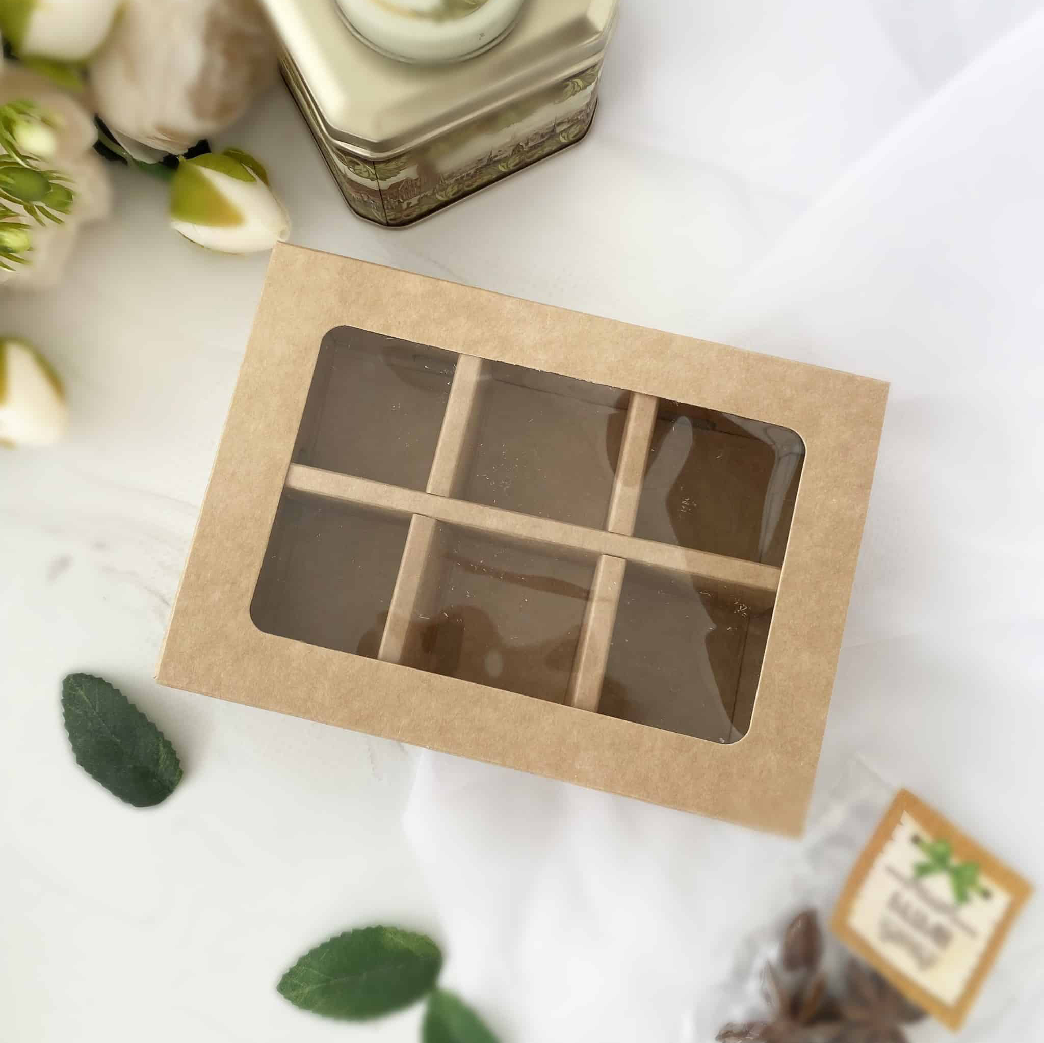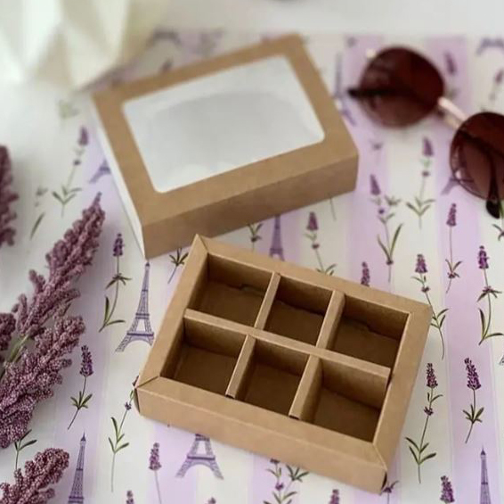 Коробка для упаковки конфет с прозрачной крышкой и внутренним разделителем.