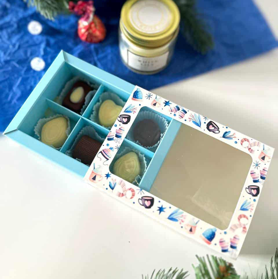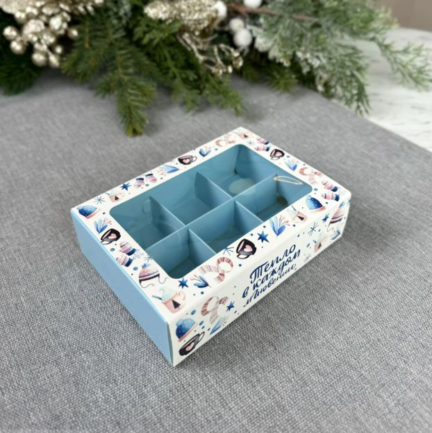Коробка для упаковки конфет с прозрачной крышкой и внутренним разделителем.