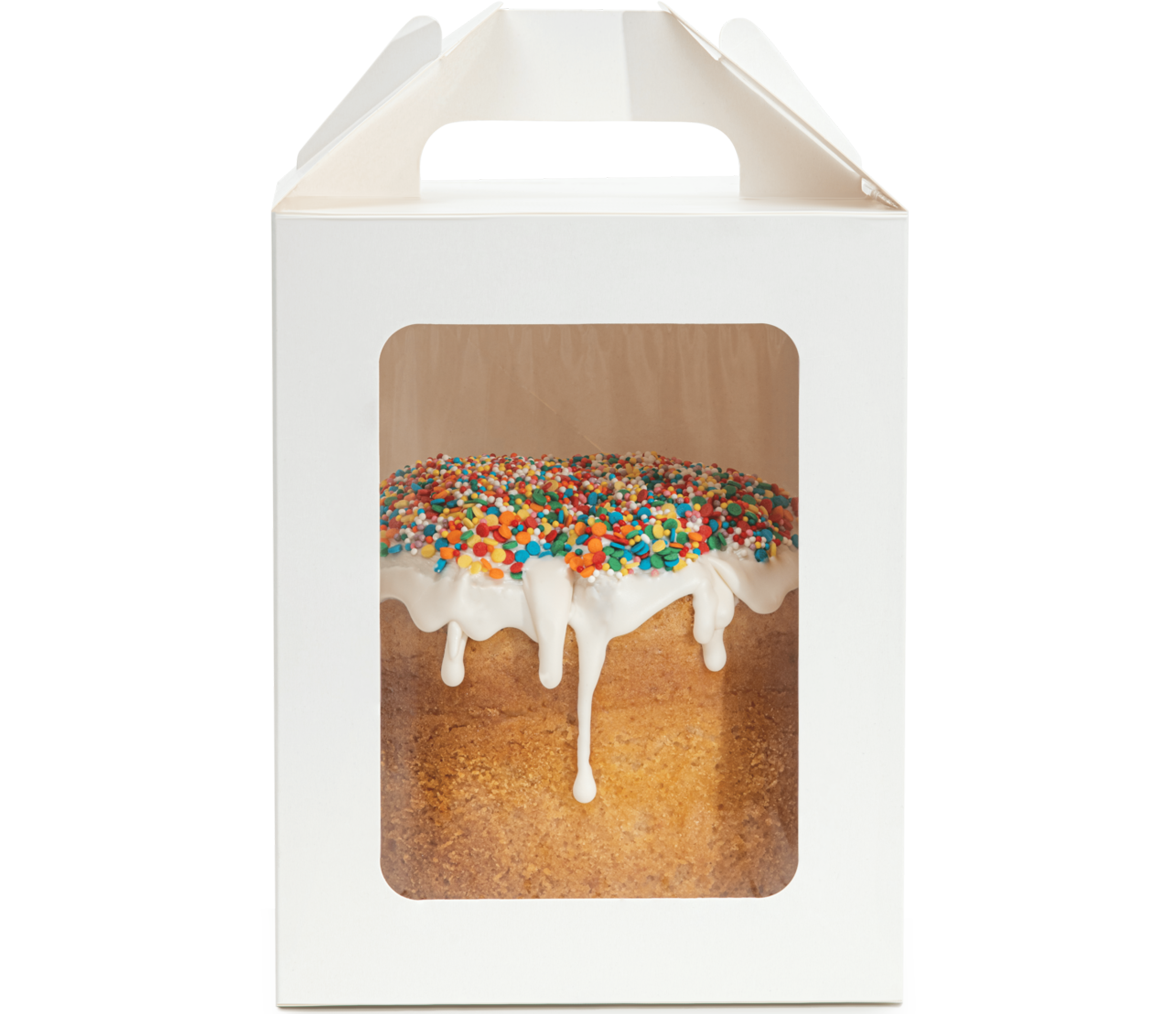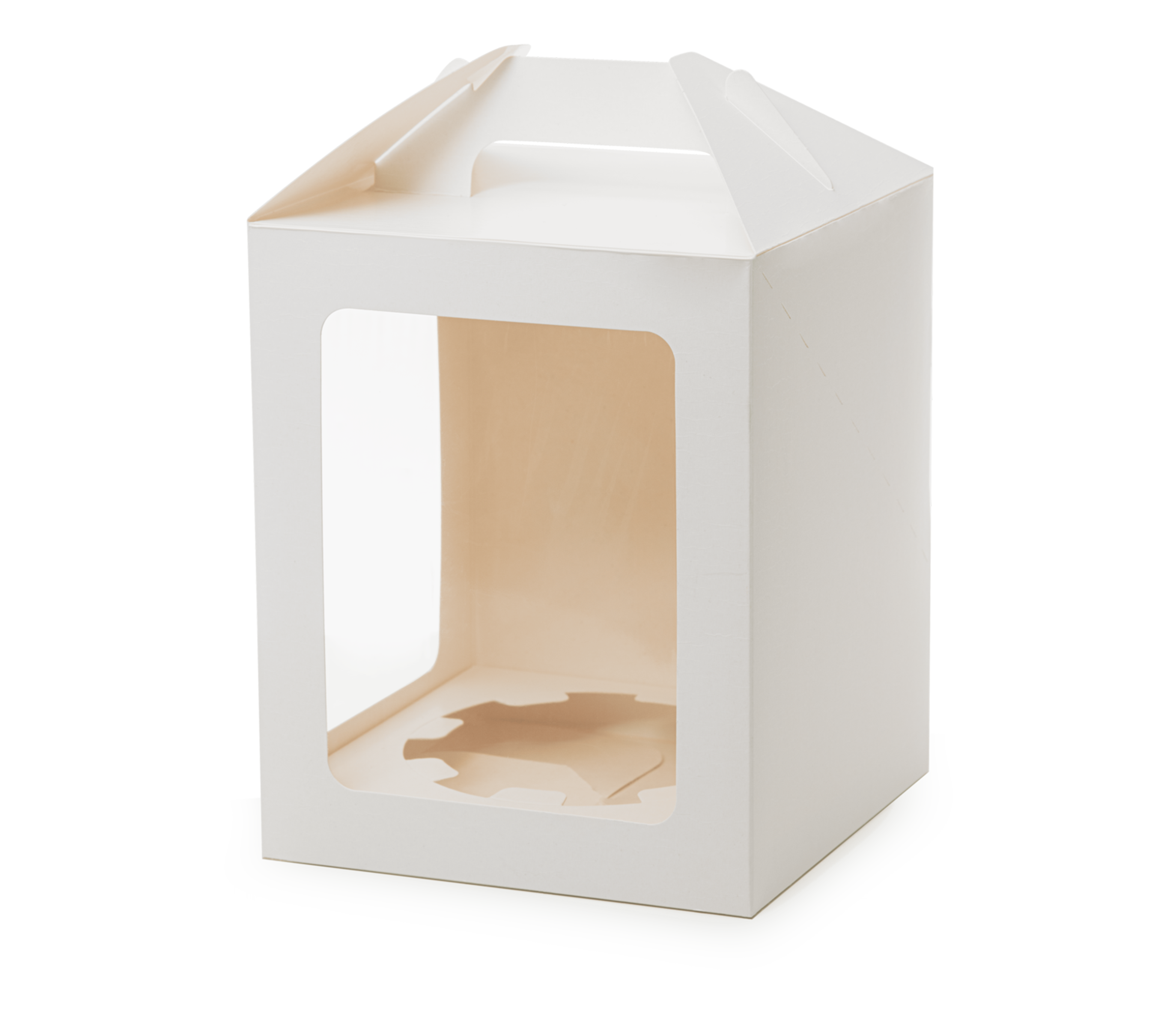 Коробка картонная с ручками и окнами для упаковки тортов, пряничных домиков и куличей.